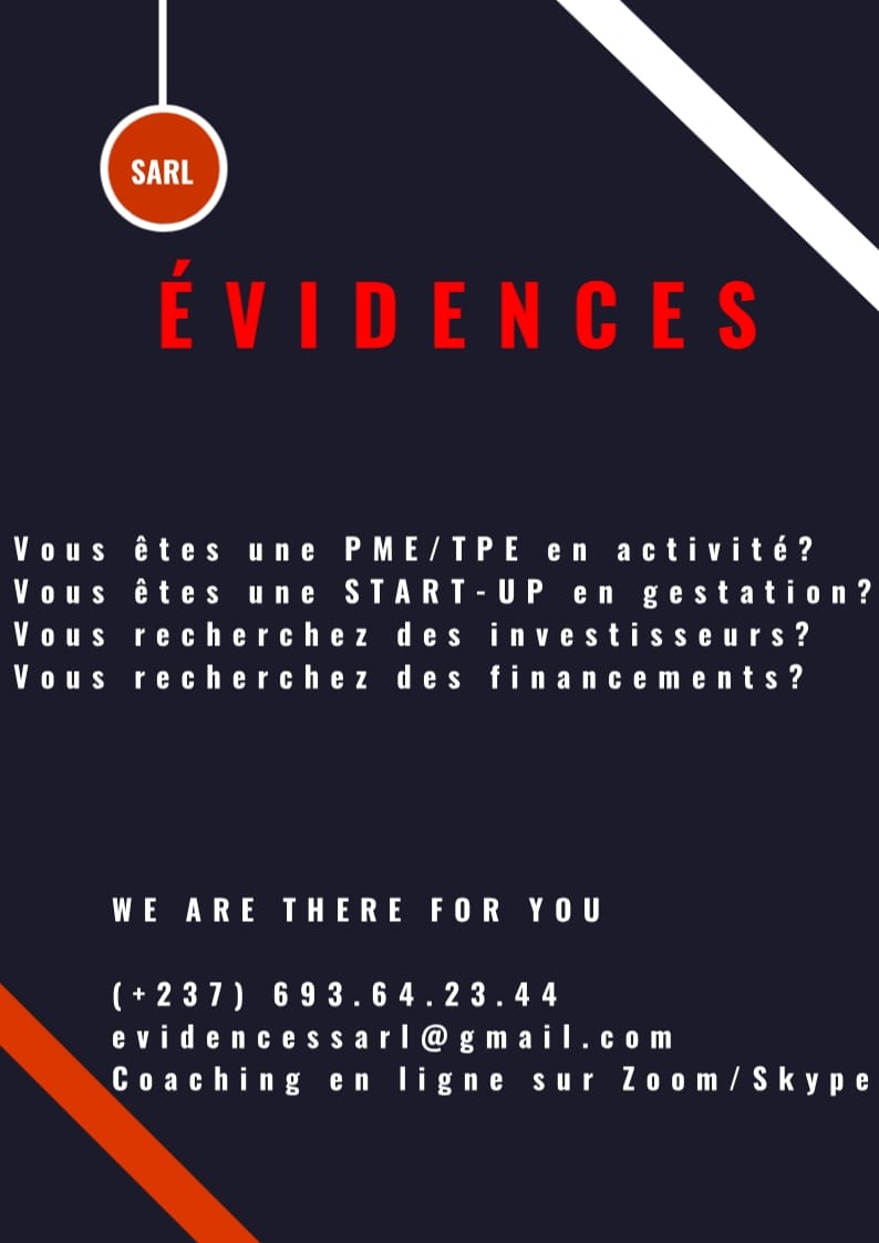 Evidences est un cabinet consulting, coaching et formations PME/TPE/Start up en ligne. Evidences vous offre : un coaching et formations pour accélérer la croissance de vos PME, TPE et Start up nationales ou diaspora ; une mise en service de vos PME, TPE et Start up sur un ensemble d’outils pouvant leur permettre de bénéficier des financements. Evidences propose aussi une étude approfondie sur les fonds d’investissements, organismes financiers et institutions bancaires pouvant financer vos PME, TPE et Start up, ainsi que des formations en ligne sur Zoom/Skype.