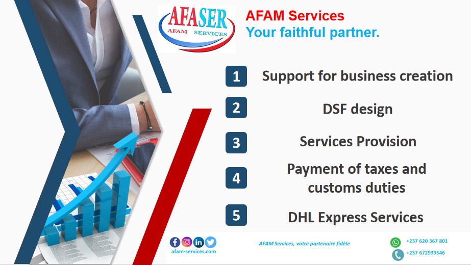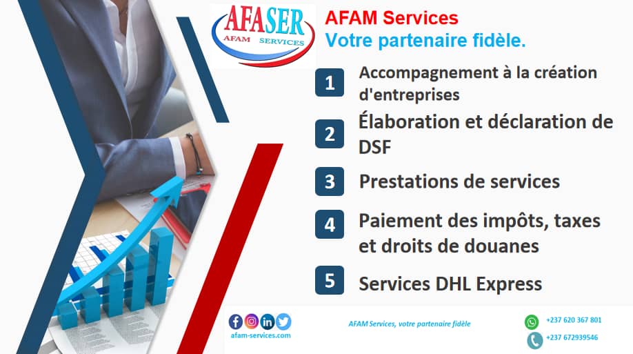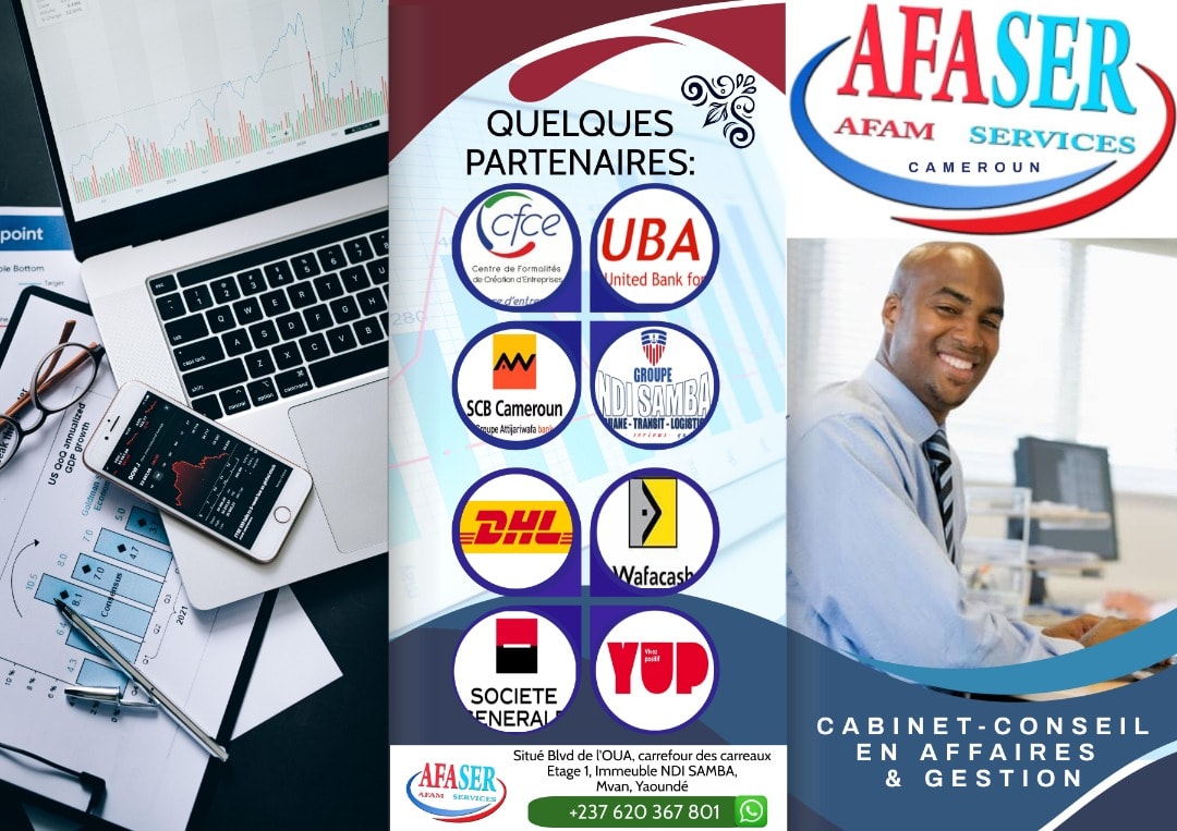 AFAM Services (AFASER) est un cabinet-conseil en affaires et en gestion au Cameroun, spécialisé dans plusieurs domaines, notamment l'accompagnement et le suivi dans la création d'entreprise, les prestations de services, le suivi fiscal, comptable et social, le transfert d'argent à l'international, l'envoie et la réception de colis via DHL, etc. AFAM Services est basé à Yaoundé, au quartier Mvan.