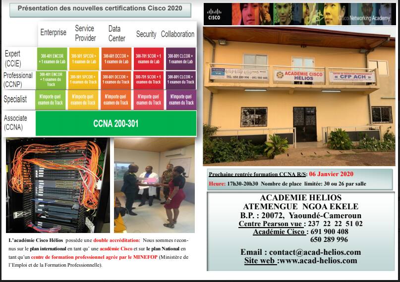 L’Académie Cisco HELIOS est une école de formation créée en 2014 et spécialisée dans la préparation aux certifications internationales. Nous sommes situés à Yaoundé, au quartier Ngoa-Ekelle, Nouvelle route du lycée de Leclerc, après le génie militaire. HELIOS est habilité à dispenser des cours de niveau CCNA Routing &, Switching, CCNA Security, CCNP et CCNP Security.