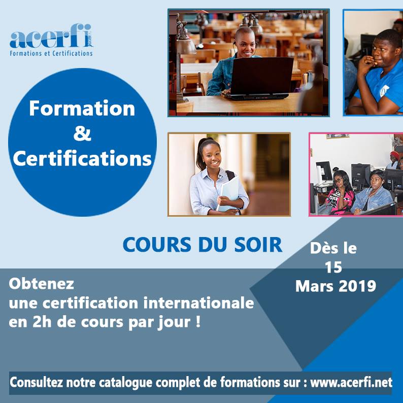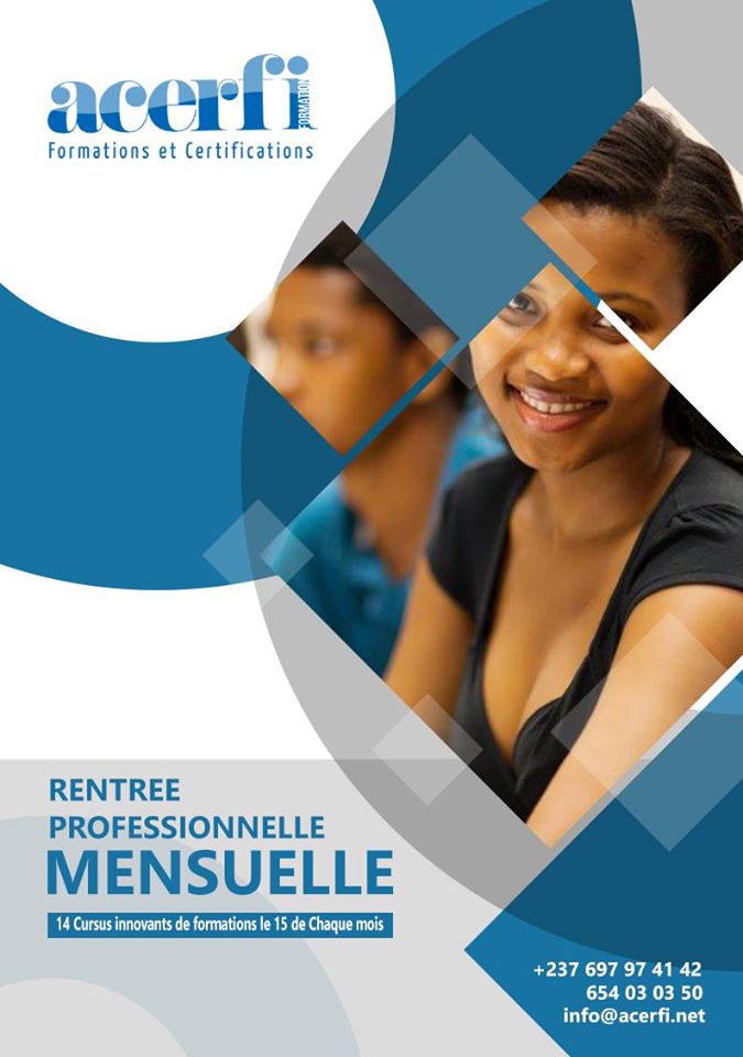 Acerfi Formation est un centre de formation et de certifications internationales, agréé par le MINEFOP et la Microsoft Imagine Academy. La durée de la formation varie en fonction de votre besoin, elle peut être longue ou courte. Les formations se déroulent en cours de jour et cours du soir. Acerfi vous propose de nombreux cursus de formation sanctionnés par 4 types de parchemin : Certifications internationales, Certificat des éditeurs, certificat du centre de formation et Diplôme de Qualification Professionnelle du MINEFOP. Nos formations sont dispensées en présentiel, auto-formation à distance, formation mixte, ou encore en classe virtuelle dans les domaines de l'Informatique, Bureautique, Multimédia, Marketing Digital et Gestion.