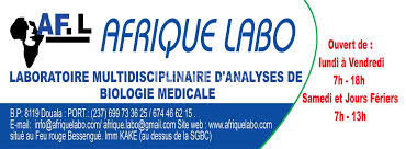 Afrique Labo (AFL) est un laboratoire multidisciplinaire d'analyses médicales dont les prestations sont dans le bilan général de santé, bilan cardiaque, bilan IST et stérilité, bilan hormonal, bilan hépatique, bilan prénuptial, anémie, diabète, marqueurs tumoraux, bilan pré et post opératoire, allergie, rhumatisme, fièvre. Afrique Labo collabore avec les autres laboratoires de référence tel que le Centre Pasteur, et le Laboratoire Cerba en France pour vous assurer de nos prestations surtout en ce qui concerne les examens à faire à l'étranger. Afrique Labo dispose d’un personnel qualifié et accueillant, équipe dynamique prêt à vous accueillir à tout moment. Nous sommes en outres partenaires avec plusieurs institutions, Chanas Assurance, Ascoma Cameroun, Allianz, Royal Onyx Assurance, Activa, Laboratoire Cerba, Centre Pasteur du Cameroun, Eurofins Biomnis, etc.