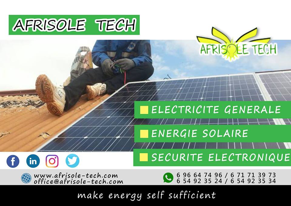 AFRISOLE TECH est une entreprise camerounaise spécialisée dans la fourniture et l'installation des équipements solaires (photovoltaïque et thermique), électriques (optimisation et efficacité énergétique) et du matériel de sécurité électronique (vidéosurveillance, alarme incendie, contrôle d'accès,etc....). Nous faisons l’étude, la conception, l'audit et la maintenance de toutes vos installations. Nous promouvons également les énergies renouvelables au Cameroun et en Afrique. Tout ceci afin de permettre aux populations d'avoir accès à l’électricité à des tarifs préférentiels. AFRISOLE TECH est partenaire avec de nombreuses entreprises qui lui font confiance.