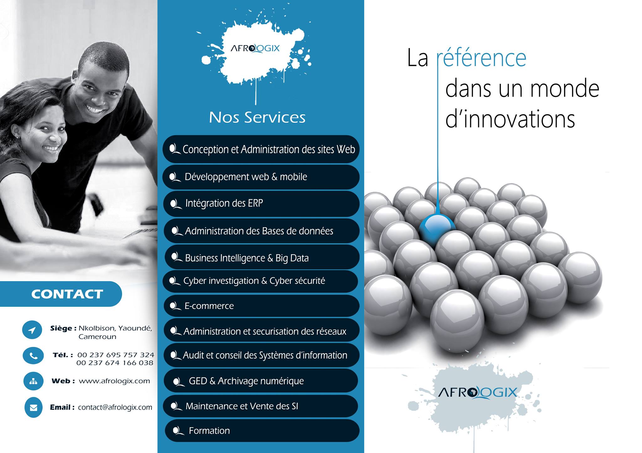 Afrologix est une société de services informatiques, qui offre une gamme complète de prestations adaptées aux besoins des entreprises et organismes de toute taille. Basée à Yaoundé, elle intervient auprès de nombreux organismes locaux et internationaux dans l’optique de les mettre à la pointe de la technologie et de l’outillage informatique de nouvelle génération pour une meilleure combativité au commerce mondial. Parmi ses services, on retrouve: l'intégration des ERP, le développement Web et Mobile, la business intelligence. Afrologix se veut une référence dans un monde d'innovations.