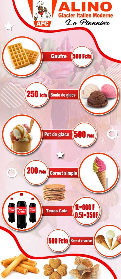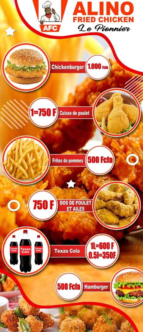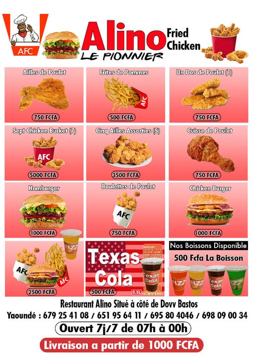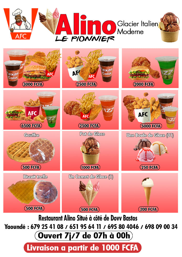 Alino Fried Chicken (AFC) est un fast food et glacier moderne italien situé à Yaoundé au quartier Bastos. Venez découvrir un menu riche en goût et en originalité.