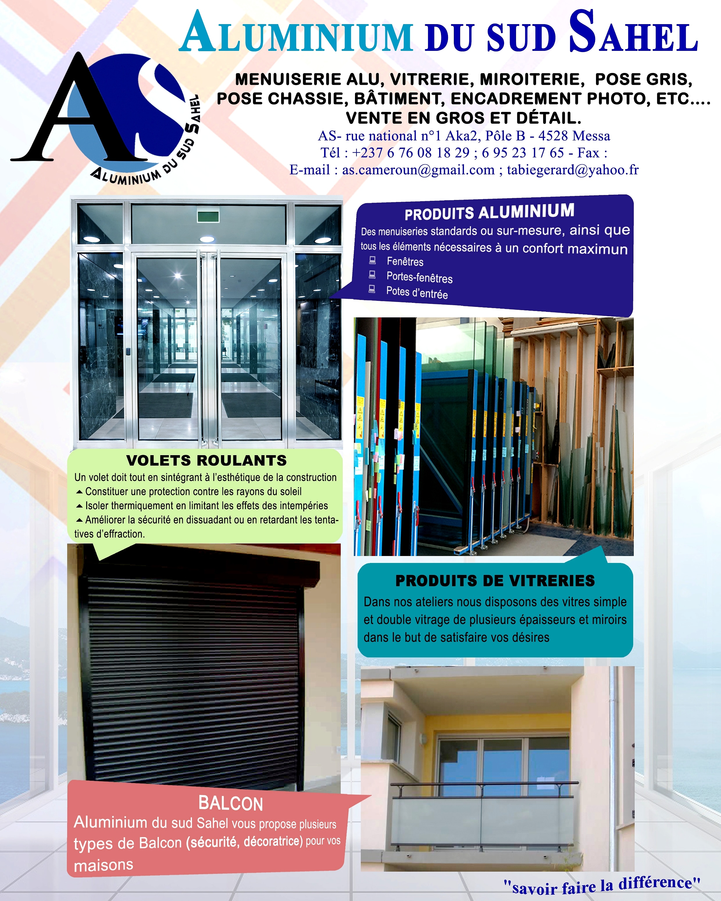 Aluminium du sud Sahel, est une société spécialisée dans la menuiserie de l’aluminium : portes, fenêtres, murs-rideaux, agencement, volets roulants, stores.