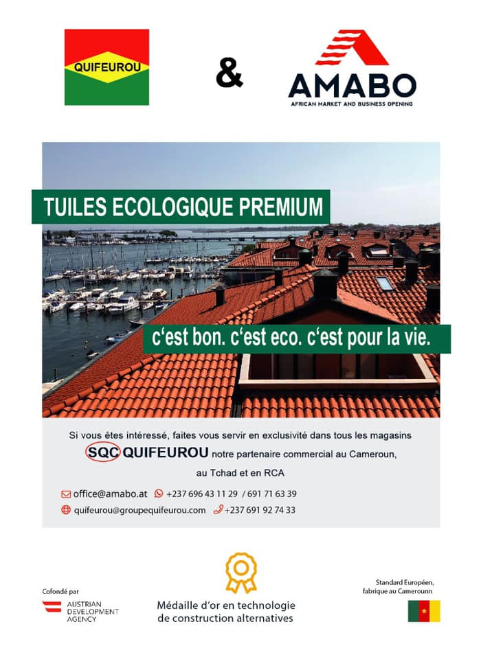 Amabo Tuiles Cameroun est une entreprise de commercialisation des tuiles. Amabo Tuiles est une innovation révolutionnaire, en toit de tuiles fait à base d’une combinaison de déchets post consumable avec du sable pour un toit en tuile presque indestructible, recyclable a 100% et de classe mondiale. Les tuiles Amabo sont 100% recyclables, produites de manière très rentable et éco-responsable. Les tuiles innovantes sont fabriquées à partir de déchets plastiques post-consommation mélangés à du sable. Ce mélange empêche l'absorption d'eau, isole du soleil et de l'humidité, rend le produit incassable et résistant au feu jusqu'à 220 degrés Celsius.