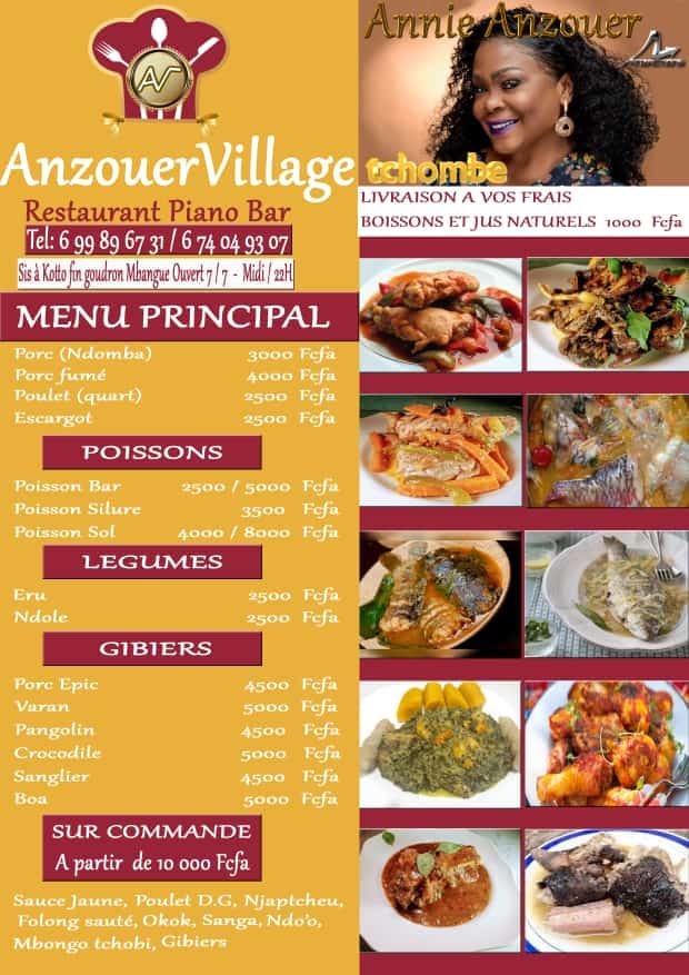 Anzouer Village est un espace de restauration qui dégage les senteurs de la cuisine camerounaise, africaine et internationale. Anzouer Village est avant tout un espace pour se restaurer et se sentir bien. Air conditionné de qualité, décoration colorée, une disposition harmonieuse des meubles. Un cadre agréable à vivre Ce d’autant plus que de belles sonorités viennent bercer les tympans.