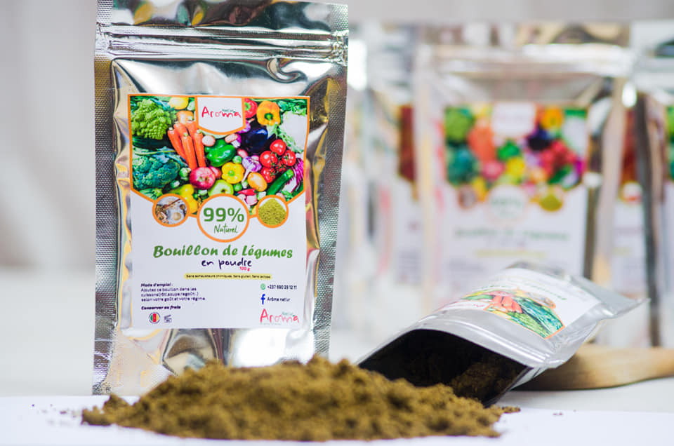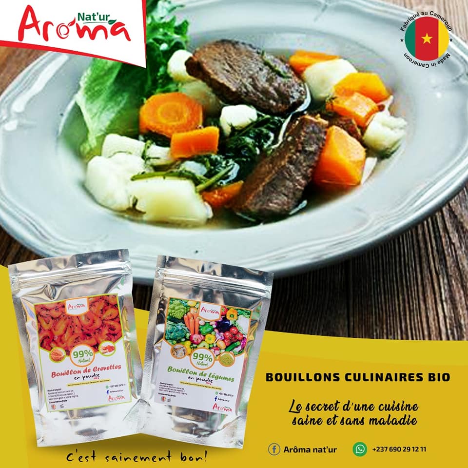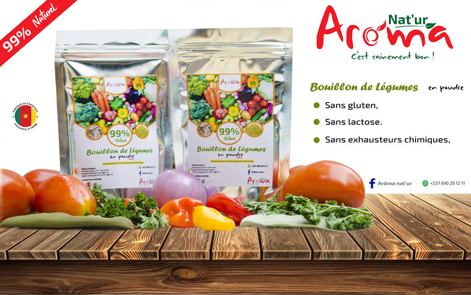 Arôma Nat'ur est une structure de production et de commercialisation des bouillons cubes bio made in Cameroun. Arôma Nat'ur offre une fabrication artisanale des bouillons de cube Bio à base des herbes aromatiques, des légumes et épices que l'on pourrait utiliser pour rehausser le goût de nos plats, sans toutefois créer une dépendance, ou encore nuire à notre santé. Ces produits sont sans gluten, sans lactose et sans exhausteurs chimiques.