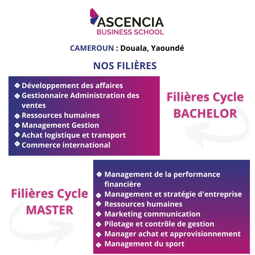 Ascencia Business School, une école supérieure française, est un établissement dédié à l'ouverture et l'accessibilité pour jeunes aspirants et professionnels désireux de se distinguer dans les domaines du commerce et du management. Depuis 2024, Ascencia Business School a ouvert ses portes sur le territoires camerounais. L'école propose ainsi, dans les villes de Douala et de Yaoundé des formations de Bachelor et Master dans les domaines du commerce et du management tels que la gestion des ressources humaines, le commerce international, les achats, la gestion des approvisionnements, le Marketing et la communication, etc.