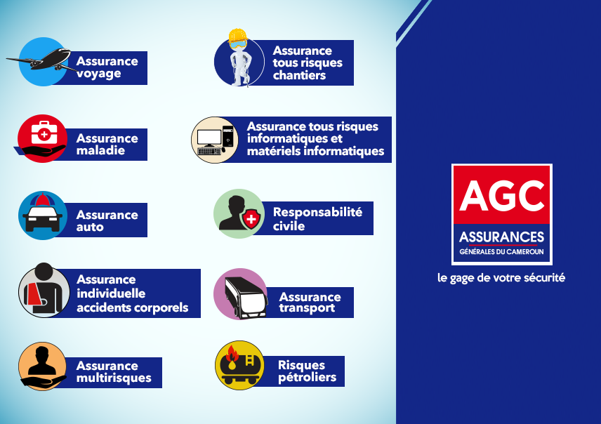 Assurances Générales du Cameroun SA (AGC) est une compagnie d’assurance au capital social de 3 000 000 000 FCFA entièrement libéré qui a démarrée ses activités en Janvier 2002 et dont le siège social se trouve à Douala. Animée par une équipe essentiellement jeune comptant 80 salariés et 150 emplois indirects, son réseau de 30 Agences reparties de manière équilibrée sur l’ensemble du territoire national lui permet d’être toujours plus proche de ses assurés. L’entreprise propose des offres en assurance maladie, assurance santé, assurance-crédit, assurance incendie, assurance aviation, assurance multirisques habitations, assurance responsabilité civile, assurance automobile. Assurances Générales du Cameroun (AGC) est une entreprise du Groupe Kadji avec plusieurs agences notamment à Douala - Bonabéri, Douala - Bonanjo, à Bertoua, Limbé, Nkongsamba, Yaoundé Centre-Ville et à Yaoundé - Obili, avec son siège social à Douala au quartier Akwa.