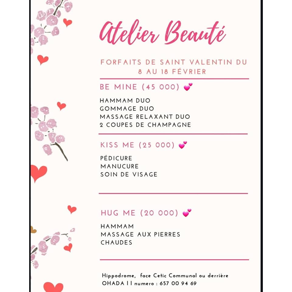 Atelier Beauté est un institut de beauté ouvert depuis mai 2018 au quartier Hippodrome à Yaoundé. Ils proposent des services d’onglerie, de coiffure mixte, les soins du visage, le massage et le hammam. Vous avez la possibilité de privatiser l’espace pour un mariage ou autres types d’événements. Les coiffeuses d’Atelier Beauté sont formées par Fanny beauty de Paris et ne reçoivent que sur rendez-vous, de quoi vous rendre le service impeccable.