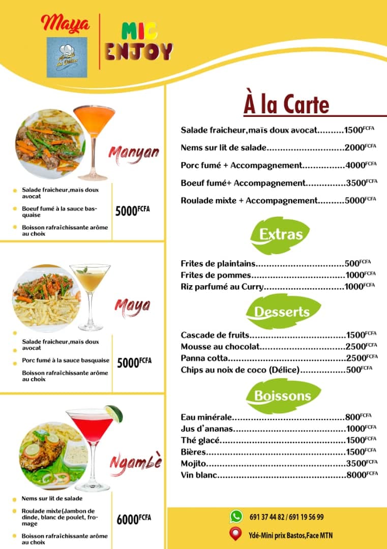 Au Café des Délices est un restaurant situé dans la ville de Yaoundé, spécialisé dans les grillades, les cocktails, les pâtisseries, les burgers et petit déjeuner. Le restaurant est en activité depuis des années et la qualité des plats et des services proposés fait sa réputation dans le quartier Bastos.