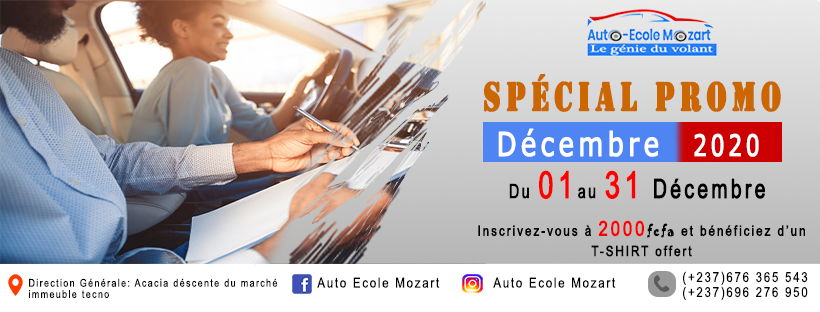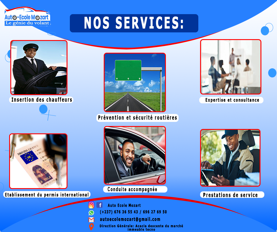 L’Auto École Mozart est une école de conduite située à Acacia, à Yaoundé. Elle vous propose, dans un cadre professionnel des cours de permis de conduire ainsi que cours audiovisuels pour maitriser le code de la route. L’Auto École Mozart vous forme pour l’obtention de votre permis de conduire national ou international en formation normale ou accélérée.