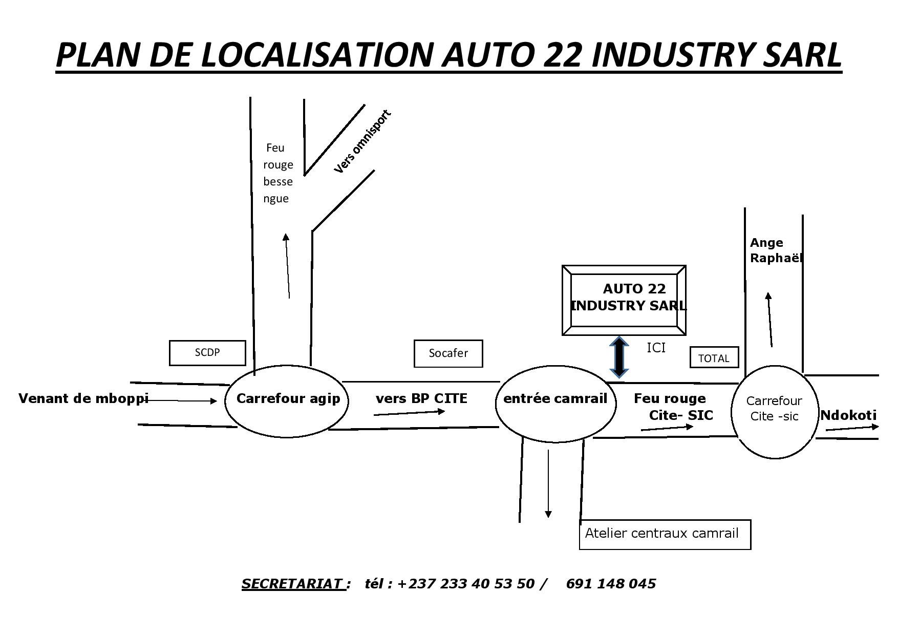 A travers une politique prononcée et exprimée qui est de mettre notre compétence, notre expertise et notre professionnalisme au service de tiers au quotidien, nous proposons à notre aimable clientèle des solutions techniques et innovantes pour mieux asseoir un partenariat sûr et constant . Auto 22 Industry Sarl, Leader de la fourniture industrielle, maritime et ferroviaire obéit à des valeurs qui se reflètent sur la performance de ses fonctions commerciales et techniques. Nos principaux services concernent: l'étancheité, la transmission, la pneumatique, l'hydraulique, la visserie, la boulonnerie, la soudure, les EPI (équipements de protection individuelle), les pièces de chariots, les matériels d'incendie, etc. Auto 22 Industry Sarl est situé à Douala, au quartier Bessengue, face entrée CAMRAIL.