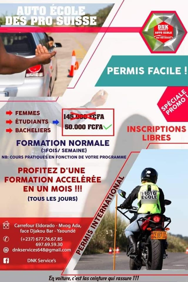 L’Auto-école des Pro Suisse est une école de conduite situé à Yaoundé au quartier Mvog-Ada. L’Auto-école des Pro Suisse vous forme pour l’obtention de votre permis de conduire national ou international en formation normale ou accélérée.