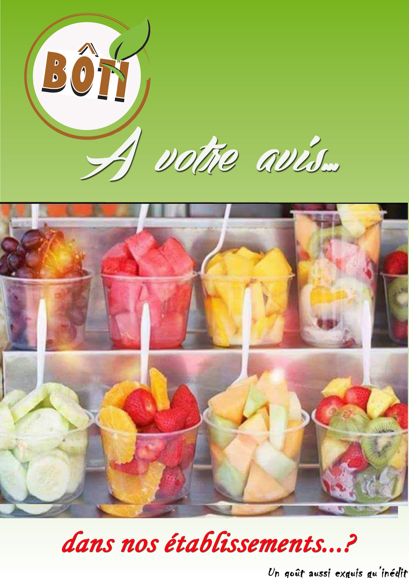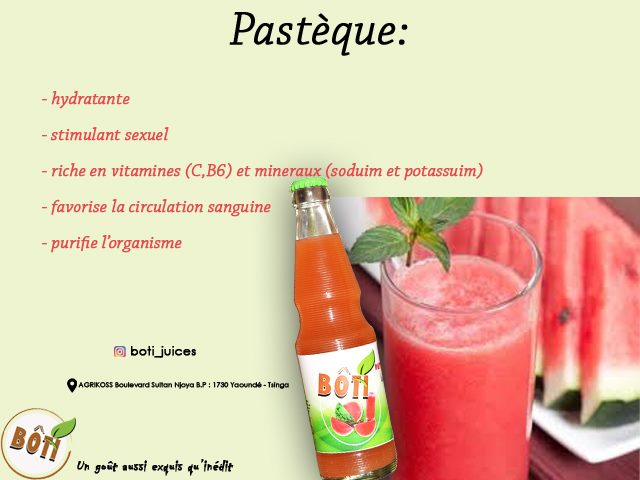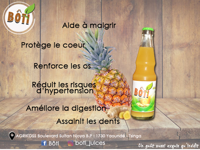 Bôti est une entreprise de fabrication et de commercialisation de jus de fruits naturels sous le nom de Bôti. Le nom Bôti, dérivé de “bôti bôti” signifie « douceur » car les fruits utilisés pour la fabrication sont issus d’une terre fertile, douce et généreuse du Cameroun. Bôti n’est pas un de ces jus d’ananas ordinaire, il est spécial parce que ses atouts majeurs sont sa teneur naturelle en sucre, son onctuosité et sa douceur. Il est élaboré à partir de fruits bio qui ont poussé naturellement au soleil et récolté à maturité.