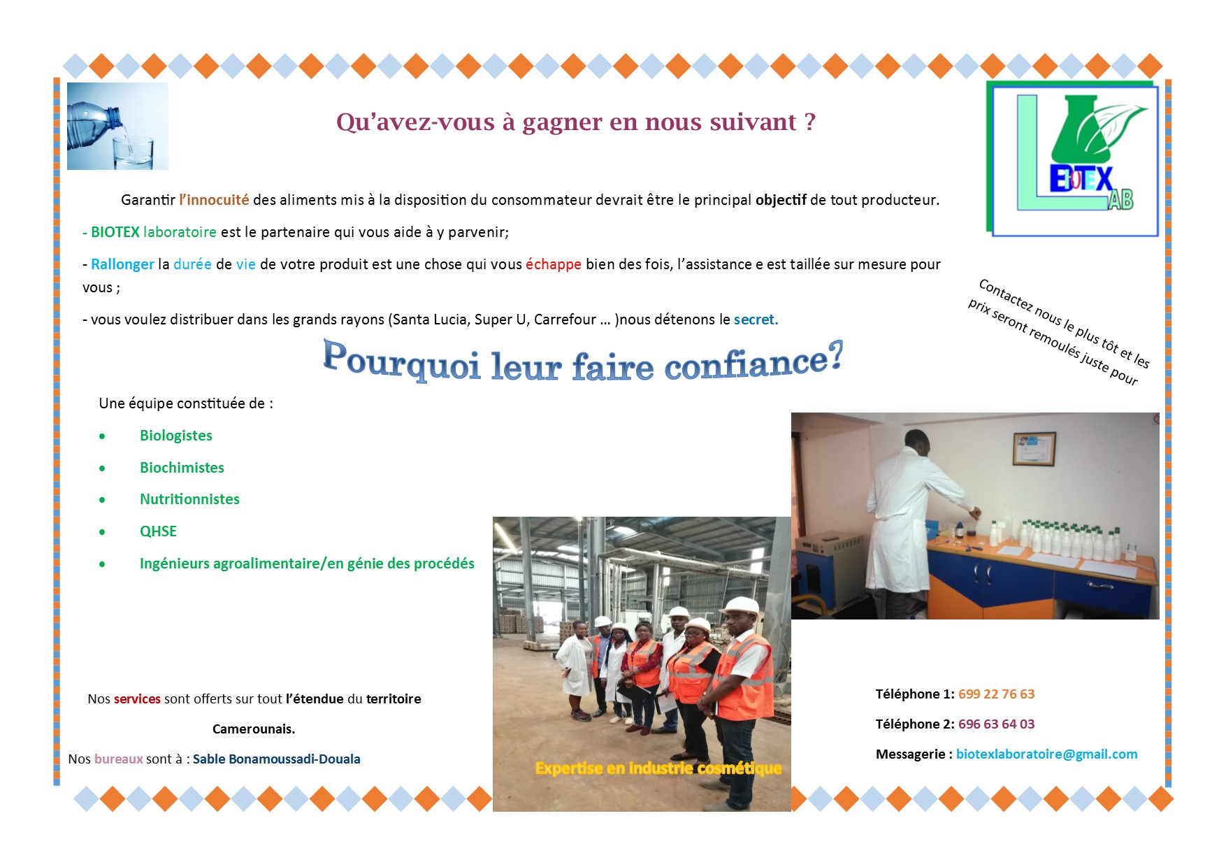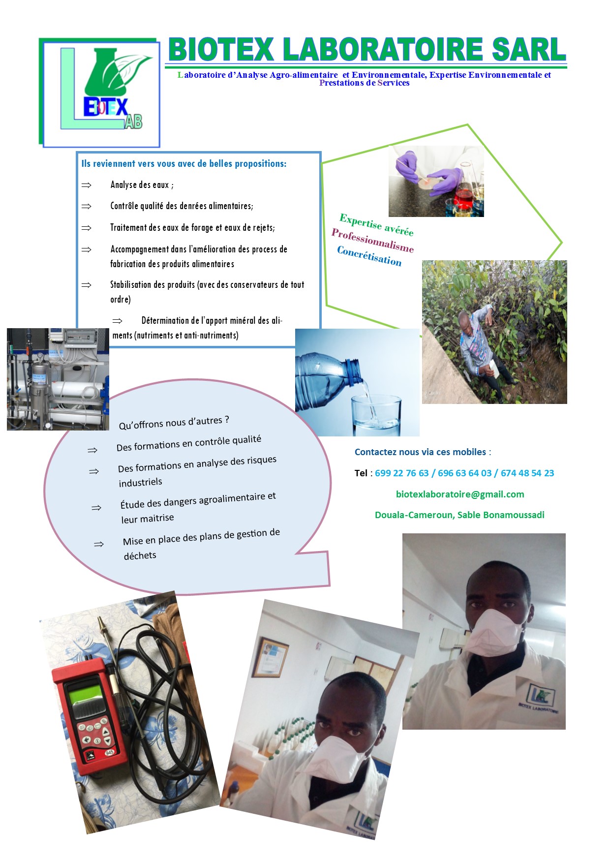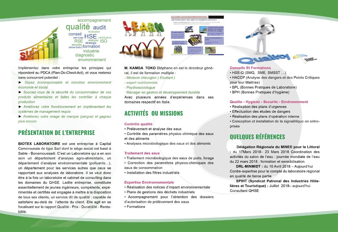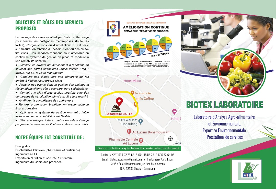 BIOTEX LABORATOIRE est une entreprise à Capital Camerounais situé à Douala qui exerce dans le contrôle des pollutions, le contrôle qualité, le domaine de la santé et sécurité au travail, elle se veut être écoresponsable, parce qu'elle tant bien que mal se bat à ne pas être en marge des prescriptions légales qui encadrent ses activités multiples. nous offrons les services suivant: