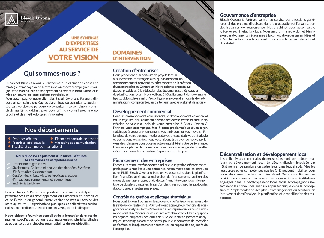 BISSEK OWONA & Partners est un cabinet pluridisciplinaire et à taille humaine, dont l'objectif est de fournir un accompagnement sur mesure aux acteurs du développement dans la définition et l'implémentation de leurs options stratégiques. Le cabinet se met au service de la diaspora, des start-ups, GIC, PME, entreprises sociales, entreprises publiques, et collectivités territoriales décentralisées, afin de leur fournir une assistance dans l'implémentation de leurs projets et dans leurs transformations organisationnelles. Fort de son équipe d'experts issus des secteurs public, universitaire et entrepreneurial, BISSEK OWONA & PARTNERS est structuré en un florilège de département (droit des affaires et de la fiscalité, du développement local, du management, de la finance et de la propriété intellectuelle) et se déploie dans les domaines de la création d'entreprise, du développement commercial, de la gouvernance et de la finance d'entreprise, du développement local, de la fiscalité et du renforcement des capacités.