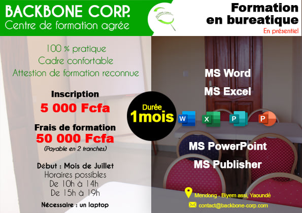 Backbone Corp est une entreprise installée à Yaoundé offrant des services informatiques. Nous travaillons avec des clients à travers le monde entier et nos spécialités sont les systèmes Linux et les réseaux informatiques. Nous excellons dans les formations depuis bon nombre d’années. Actuellement nous affinons nos compétences dans le multimédia avec notre équipe qui est essentiellement constituée d’ingénieurs informaticiens certifiés sur les technologies LINUX, MICROSOFT et CISCO. Backbone Corp est dirigée par une équipe très compétente et détentrice de nombreuses certifications internationales