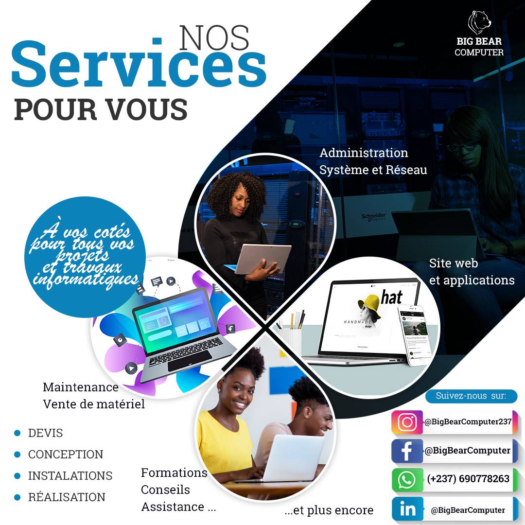 Big Bear Computer est une entreprise qui s'efforce de faciliter l'accès à des solutions informatiques innovantes, proposer des produits et services de qualité. Big Bear Computer est l’entreprise et ce centre de formation qui abrite des jeunes passionnés du numérique, prêt et disposés à vous apporter leur savoir-faire dans différents domaine de formations. Nous sommes basés à Yaoundé aux quartiers Soa et Mimboman.