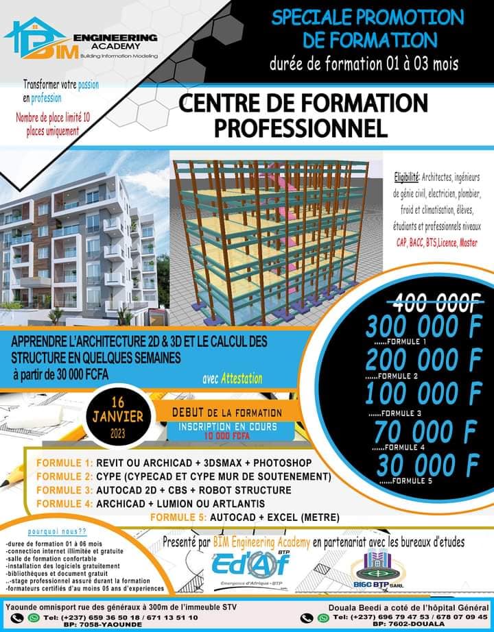 Bim Engineering Academy est un centre de formation professionnel qui forme en architecture, ingénieur structure, ingénieur économiste, designers, projecteur métreurs, électricité et plomberie. Bim Engineering c'est des formations complètes en présentiel Douala et Yaoundé ainsi qu’en ligne partout dans le monde sur les logiciels de génie civil.