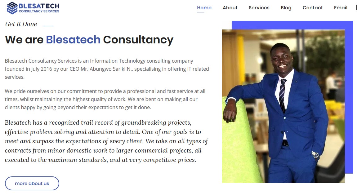 Blesatech Consultancy Services is an Information Technology consulting company founded in July 2016 by our CEO Mr Sariki Ngu Abungwo; specializing in offering IT related services. We pride ourselves on professional and fast service, while maintaining the highest quality of work. We are bent on making our customers happy by going beyond their expectations to get it done. Blesatech Consultancy Services has a recognized record of groundbreaking projects, effective problem-solving and attention to detail, one of our goals is to meet the expectations of every customer. We take on all types of contracts and we work on larger projects. We Offer Services such as: Graphic Design Web Design Video Editing IT Support Photography Digital Marketing Interactive Presentations