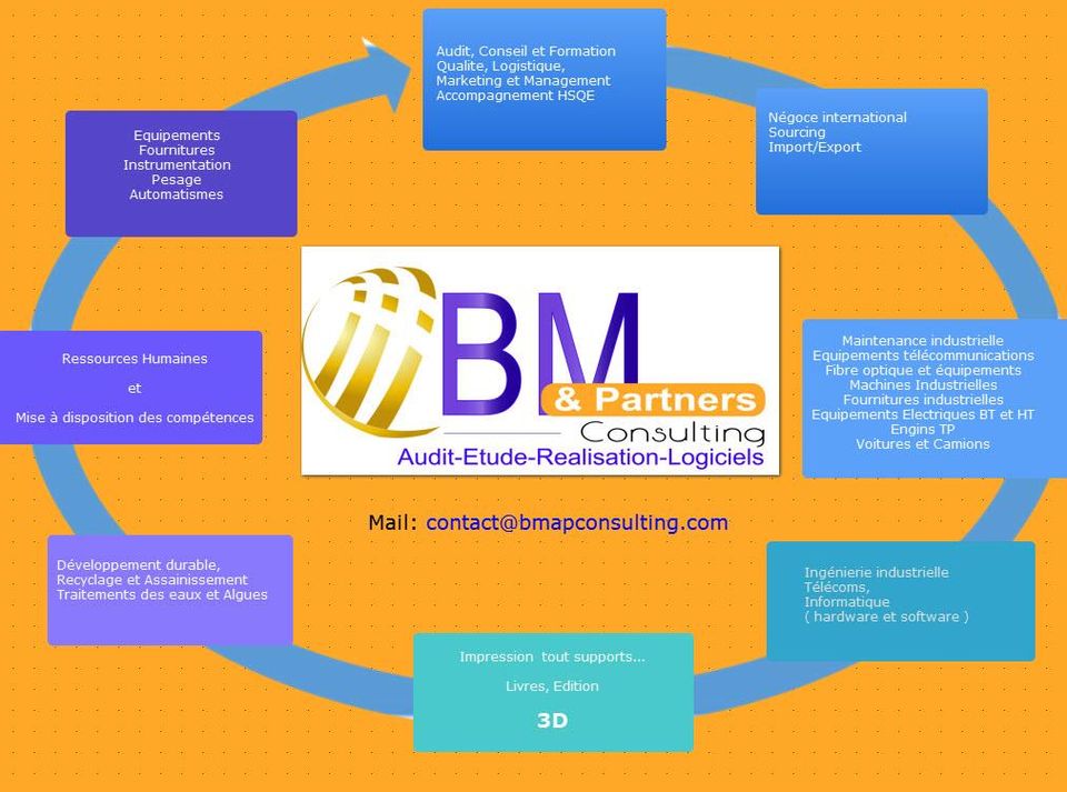 BM and Partners Consulting est une société multiservices spécialisée en : Imprimerie, informatique, électricité, télécommunications, marketing, management, logistique, ingénierie industrielle, fournitures des équipements industriels, négoce international. Conseil, accompagnement, réalisation et formation sont nos outils pour faire progresser la performance globale de votre entreprise en développant les compétences structurelles de l’entreprise, et opérationnelles de vos équipes. Notre démarche vise les entreprises, organisations gouvernementales et internationales, ONG, institutions publiques, nous vous sollicitons dans la perspective de développer un partenariat durable. Notre équipe est composée de professionnels expérimentés (Ingénieurs) et des Universitaires spécialisés. L’historique professionnel de chacun, notamment en matière de conseil, ainsi que la polyvalence des membres de l’équipe les ont habitués à poser un regard global et transversal sur les projets qui leur sont confiés et contribueront à apporter des solutions et des propositions pragmatiques. Notre compétence transversale nous permet de vous accompagner à la recherche de solutions efficaces aux défis qui se posent à votre entreprise. Nos propositions couvrent plusieurs domaines de votre entreprise.
