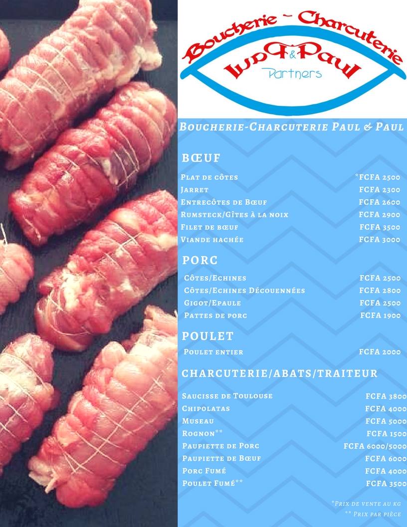 Boucherie Charcuterie Paul & Paul est une unité de distribution de viande fraîche (Bœuf, Porc et poulet) ainsi que ses dérivés (Saucisses, viandes fumées, et abats). Nous mettons à votre disposition les meilleurs produits en provenance des élevages du terroir.