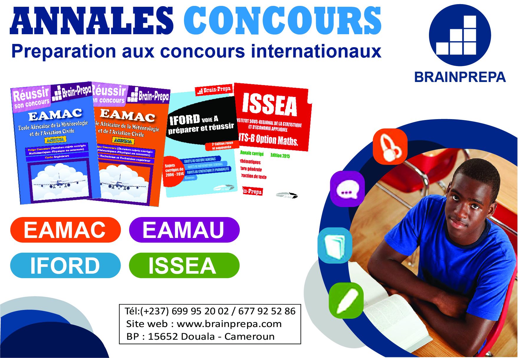 BrainPrepa est un centre d’orientation scolaire et de préparation aux concours. BrainPrepa est d’abord une équipe de conseillers d’orientation qui vous écoute, vous diagnostique et vous oriente vers la filière ou le concours qui vous sera le plus bénéfique après votre baccalauréat. BrainPrepa est ensuite une équipe d’enseignants chevronnés qui préparent les bacheliers aux différents concours officiels camerounais et internationaux. BrainPrepa est enfin, un grand centre de documentation ; nous disposons à cet effet d’une bibliothèque de plus de 100 fascicules, livres et annales et d’une base de données des derniers sujets des principaux concours camerounais et internationaux.
