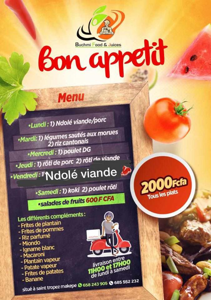 Buchmi Food & Juices est un restaurant Fast Food situé à Makepe Saint Tropez. Buchmi Food & Juices vous propose la livraison des plats appétissant, chauds, sur commande et ceci en peu de temps.