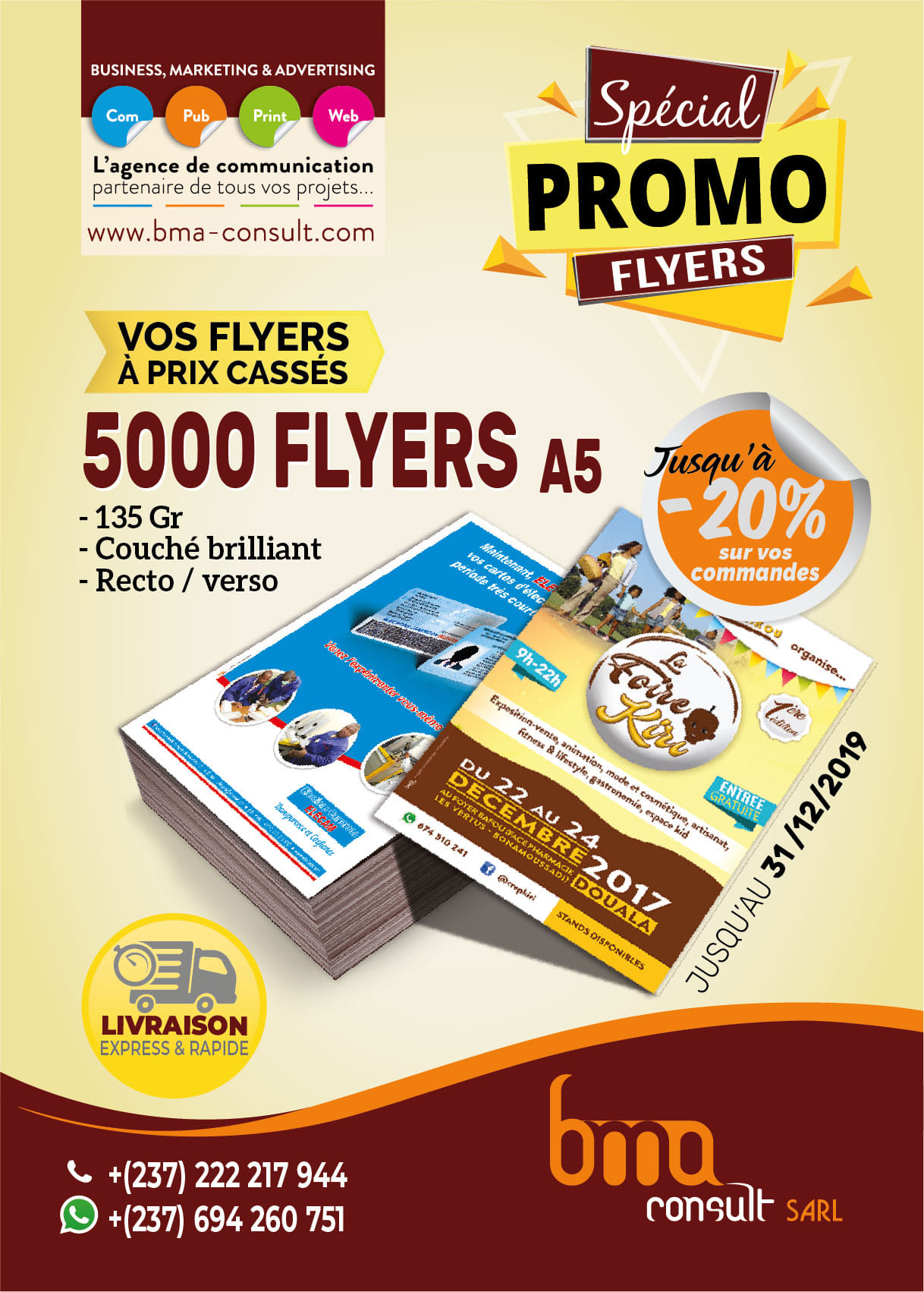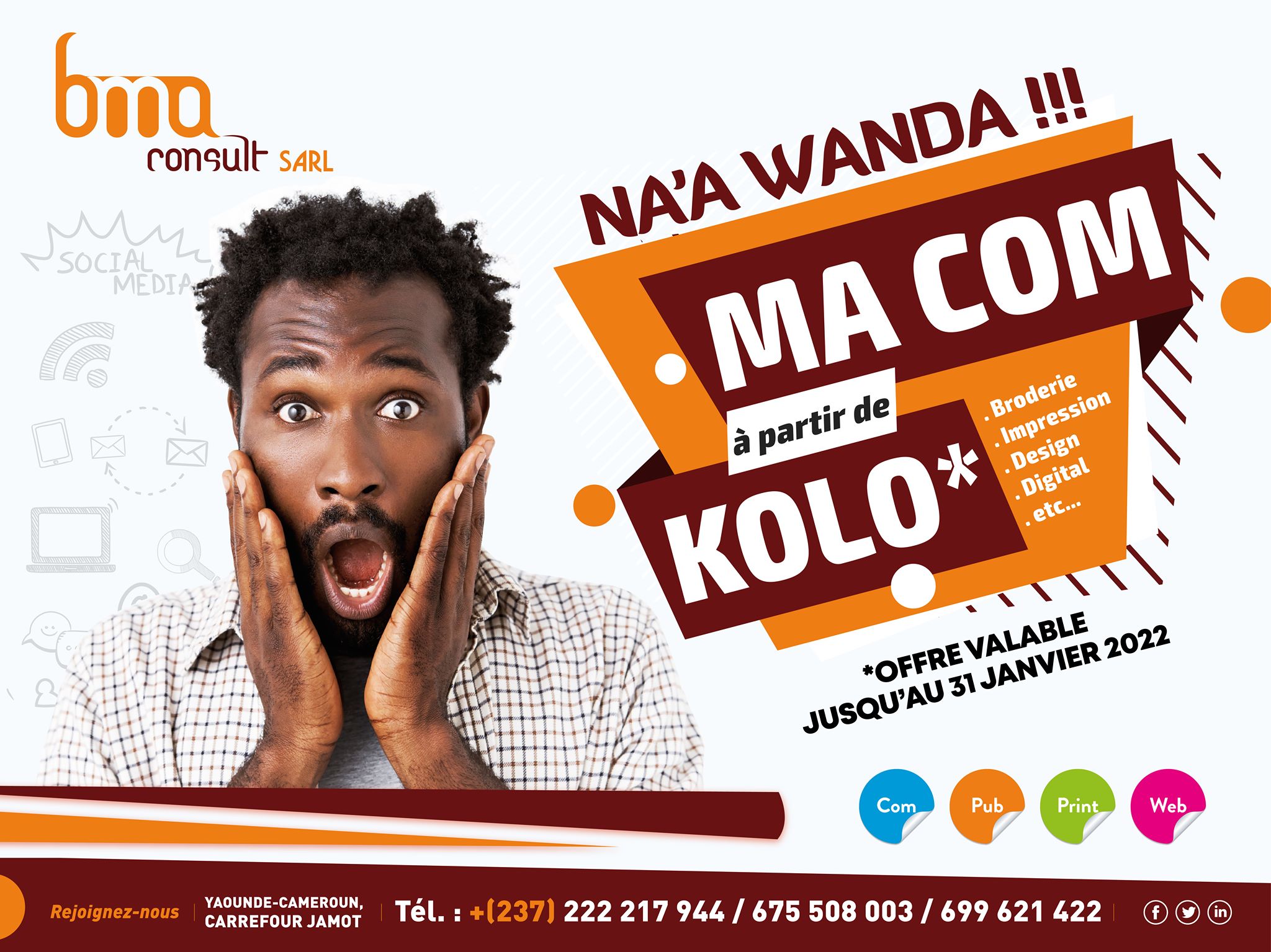 Business Marketing Advertising (BMA) est une agence de communication spécialisée dans la communication imprimée et la communication sur internet à travers une équipe de professionnels spécialistes de la publicité, le design, le marketing, l’imprimerie, le journalisme.