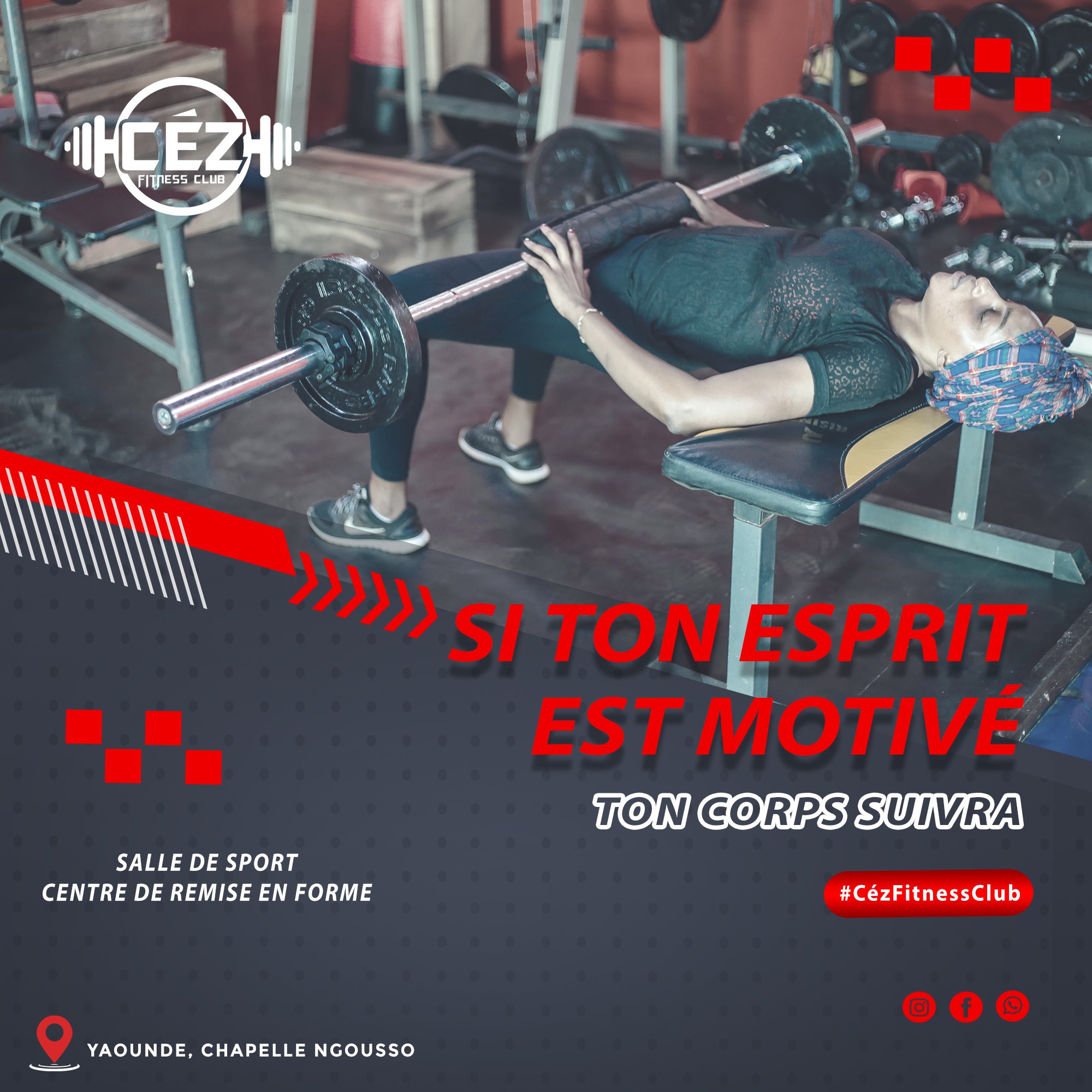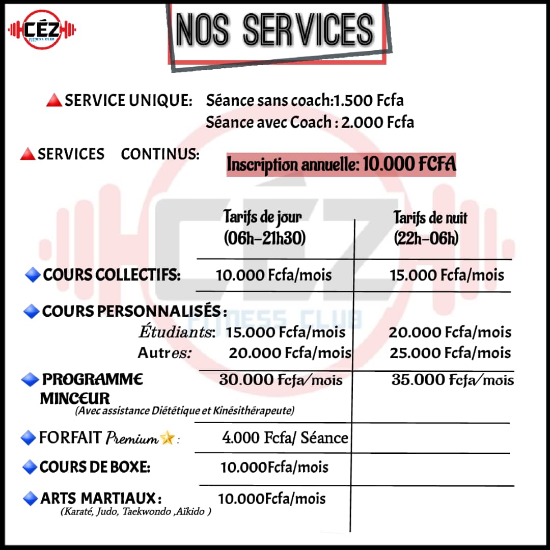 Céz Fitness Club est une salle de sport et centre professionnel de remise en forme situé à Yaoundé au quartier Ngousso. Au Céz Fitness Club, vous pouvez aussi pratiquer des arts martiaux (Judo, Aikido, Karaté, Taekwondo) et de la boxe. Nos clubs sont à la pointe du fitness. Venez nous voir pour vous en rendre compte ! C’est peut-être facile à dire, mais voir faire du sport motive à faire du sport.