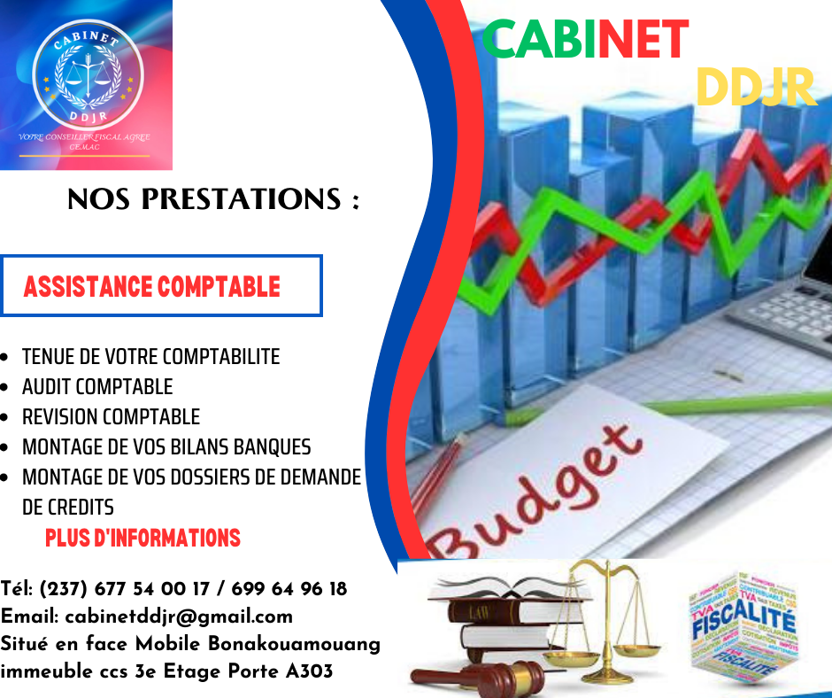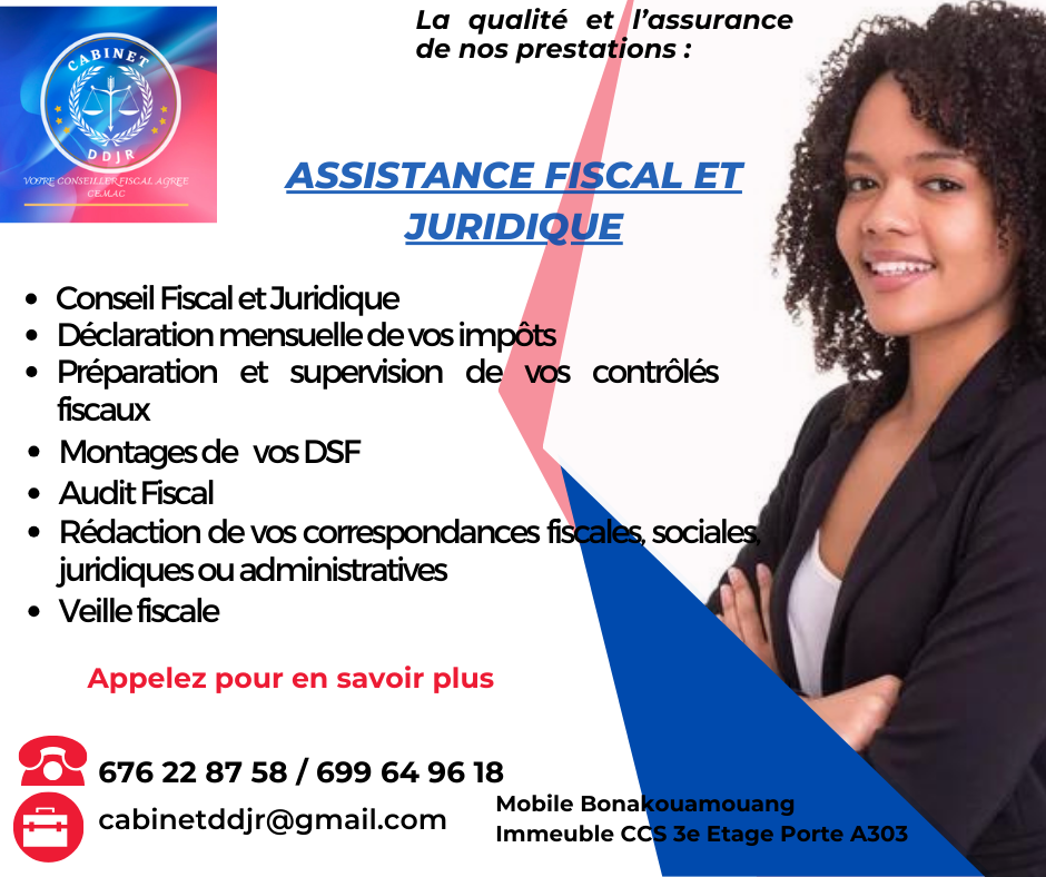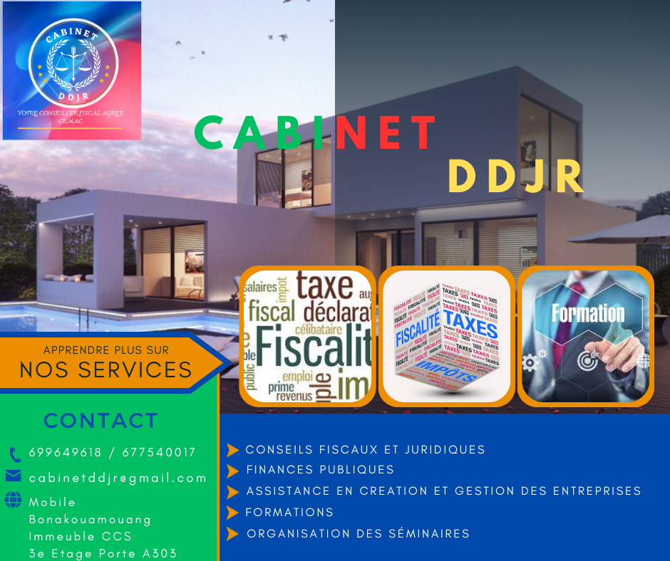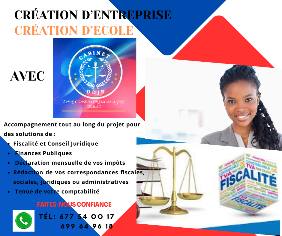 CABINET DDJR est une entreprise spécialisée dans les domaines suivant: -Conseil Fiscale et Juridique, -Finances Publiques, -Assistance en création et en gestion des entreprises, -Formations, -Organisations des séminaires. Avec le CABINET DDJR, bénéficiez des innovations fiscales de l'année en cours en créant votre entreprise simplement et rapidement ! Pour 𝐋𝐚 𝐂𝐨𝐧𝐬𝐭𝐢𝐭𝐮𝐭𝐢𝐨𝐧 𝐋é𝐠𝐚𝐥𝐞 𝐝𝐞 𝐯𝐨𝐭𝐫𝐞 𝐄𝐧𝐭𝐫𝐞𝐩𝐫𝐢𝐬𝐞, lors d'un entretien, nous vous conseillons au préalable sur: - la 𝐅𝐨𝐫𝐦𝐞 𝐣𝐮𝐫𝐢𝐝𝐢𝐪𝐮𝐞 adéquate pour votre activité ; - la 𝐑é𝐩𝐚𝐫𝐭𝐢𝐭𝐢𝐨𝐧 𝐝𝐞𝐬 𝐩𝐚𝐫st 𝐬𝐨𝐜𝐢𝐚𝐥𝐞𝐬 ; - la 𝐅𝐨𝐫𝐦𝐞 𝐟𝐢𝐬𝐜𝐚𝐥𝐞 idéale; Et enfin, 𝐧𝐨𝐮𝐬 𝐧𝐨𝐮𝐬 𝐨𝐜𝐜𝐮𝐩𝐨𝐧𝐬 𝐝𝐞 𝐥𝐚 𝐫é𝐝𝐚𝐜𝐭𝐢𝐨𝐧 𝐜𝐨𝐦𝐩𝐥è𝐭𝐞 𝐝𝐞 𝐭𝐨𝐮𝐬 𝐥𝐞𝐬 𝐝𝐨𝐜𝐮𝐦𝐞𝐧𝐭𝐬 𝐧é𝐜𝐞𝐬𝐬𝐚𝐢𝐫𝐞𝐬 et de 𝐭𝐨𝐮𝐭𝐞𝐬 𝐥𝐞𝐬 𝐝é𝐦𝐚𝐫𝐜𝐡𝐞𝐬 pour la création de votre entreprise. 𝐃𝐨𝐜𝐮𝐦𝐞𝐧𝐭𝐬 À 𝐨𝐛𝐭𝐞𝐧𝐢𝐫 : STATUTS ATTESTATION DE CRÉATION NUMÉRO DE CONTRIBUABLE (NCC) REGISTRE DE COMMERCE (RCCM) ATTESTATION D’EXONÉRATION FISCALE AFFILIATION CNPS NOS SERVICES D’ASSISTANCE - Tenue régulière de la Comptabilité - Conseiller Financier et fiscale - Établissement mensuel des déclarations Fiscales (Impôts) - Établissement mensuel des déclarations Sociales (CNPS) - Gestion des stocks - Gestion de la PAIE (Bulletins de paie,etc...) - Tableaux de bord (Reporting) - Montage de dossier de crédit (Prêt bancaire) - Élaboration des états financiers - Certification des états financiers (Visa fiscal) CABINET DDJR T'ASSISTE A CHAQUE ÉTAPE!!!! contacte nous via whatsapp 676 22 87 58 INFO LINE: 6 99 64 96 18 L'ASSISTANCE QU'IL TE FAUT POUR AVOIR TON ENTREPRISE LÉGALEMENT.