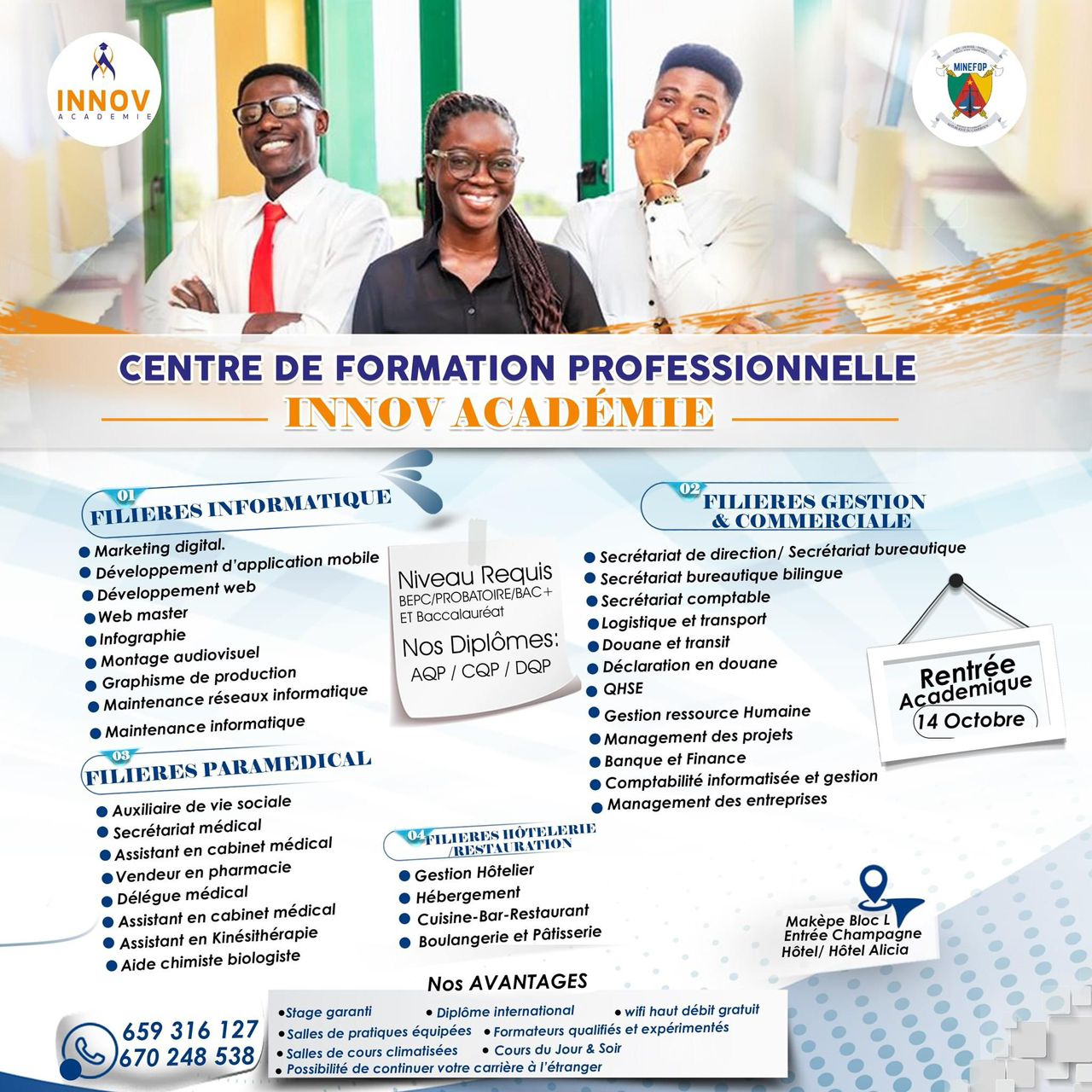 Innov academie est une institution de formation professionnelle dédiée à l'encadrement et à l'insertion socio-professionnelle des jeunes au Cameroun. Située à Makepe Bloc L, notre académie se distingue par son engagement envers l'innovation et l'excellence. Nous offrons des formations dans les domaines paramédical, informatique, gestion, hôtellerie et restauration, répondant aux besoins actuels du marché du travail. Notre mission est de préparer les jeunes à réussir dans leurs carrières professionnelles et à contribuer au développement économique du Cameroun.