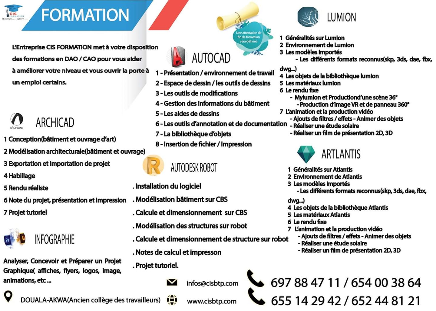 Le cabinet CIS BTP Sarl (Cabinet D’ingénierie, de formation de suivi, et de réalisation des travaux du BTP) a été créé en 2016 par un ingénieur du génie civil. Il comprend un département Ingénierie, un département formation, un département immobilier, et un département suivi et réalisation. Dans le domaine du bâtiment et des travaux publics nous offrons : Une étude complète du projet de construction (étude géotechnique, étude topographique, étude architecturale, étude structurelle, étude technique, étude financière), La planification du projet (Production d’images 2D et 3D, Calcul de structure, Devis), Le suivi du dossier en vue de l’obtention du permis de bâtir, Le suivi du projet durant son exécution, La réalisation du projet. Depuis peu, CIS BTP c'est aussi un département de prestation de services (maçonnerie, électronique, menuiserie, plomberie, vitrerie, électricité, électricité, rénovation) dénommé SOS CIS