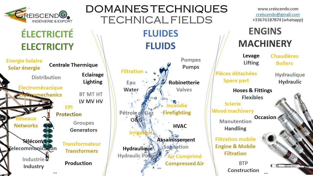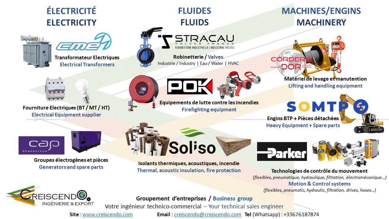 Creiscendo est un groupement de fabricants et spécialistes en matériels techniques et mécaniques européens, ainsi qu'un réseau d'ingénieur technico-commerciaux multicartes à l'export, pour satisfaire vos projets et répondre à vos besoins. Découvrez nos 3 champs d'actions : Electricité + Fluides + Engins/Machines/Accessoires Site : www.creiscendo.com Que vous soyez un bureau d'étude, un installateur technique, une société de maintenance, un industriel, une société de fourniture ou distribution..., n'hésitez pas à nous contacter pour vos projets et besoins. Nous recherchons des partenaires en Afrique. Contact : creiscendo@creiscendo.com Nos agents travaillent directement pour les spécialistes et fabricants : STRACAU, SOMTP, SOLISO, PARKER, POK, CORDERIE DOR, CME, CAP, EAS... Vous recevez une réponse en direct de nos équipes au chiffrage/cotation (qualité, réactivité, disponibilité/stock). Nous travaillons également avec des réseaux de distribution/revente locaux (si nos produits peut vous intéresser n'hésitez pas). Nos produits : FLUIDES + Vannes et robinetterie (Eau, HVAC et Industrie) + Tuyauterie + Isolation thermiques, acoustique, protection incendie + Outils de calorifugeage + Pompes + Equipement de lutte contre les incendies (RIA, PIA, lances) + Filtration + Air comprimé (compresseur, sécheurs, raccords, tuyaux, embouts...) + Matériel médical ... ÉLECTRIQUE + Transformateurs électriques, + Groupes Électrogènes + Cellules, + Matériel BT / MT / HT + Courant faible + Variateur de vitesse, électromécanique industrielle ... ENGINS + MACHINES + Matériel de levage et manutention (palans, treuils, cordage, câbles, nacelles...) + Pièces détachées (CAT, Volvo, Liebherr, Komatsu, Renault, MAN, DAF, Mercedes, JCB, Terex, Manitou...) + Outils d'attaques au sol (Godet, Lames, Dents, BRH...) + Trains de chaines et pièces d'usures + Engins d'occasion (chantier, agricole...) + Flexibles hydraulique Parker Hannifin + Filtration mobile (hydrocarbure + huile hydraulique) + Machine pour l'industrie du bois + Chaudière biomasse ...