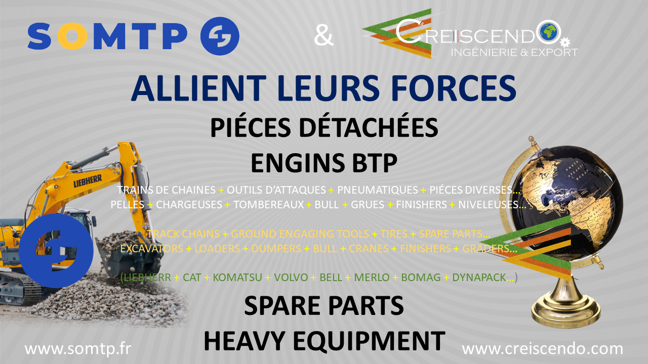 - Pièces détachées (CAT, Volvo, Liebherr, Komatsu, Renault, MAN, DAF, Mercedes, JCB, Terex, Manitou...)