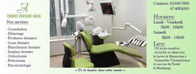 Le Cabinet Dentaire Inaya est un centre de soins dentaires situé à Yaoundé au quartier Biyem Assi. Le Cabinet Dentaire Inaya est bien équipé et offre de nombreux services de qualité comme : les consultations, détartrage, pose prothèses dentaires, soins dentaires, blanchiment dentaire, pose implant dentaire, orthodontie, pédodontie, parodontologie.
