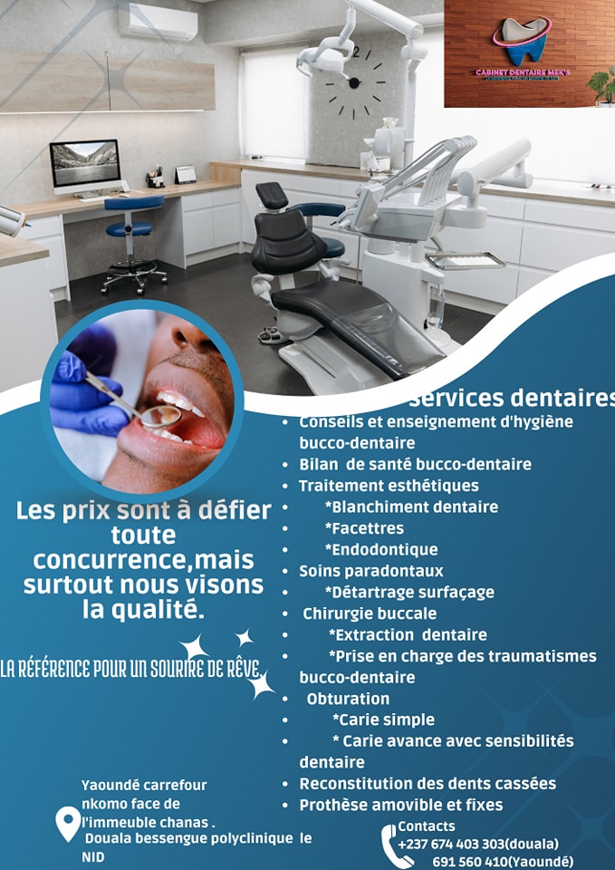 Le Cabinet Dentaire Mek's est un cabinet dentaire privé situé à Yaoundé au quartier Nkomo et à Douala à Bessengue. Le Cabinet Dentaire Mek's a pour objectif de vous fournir des soins de qualité dans une bonne ambiance familiale et moderne. Nos services tournent autour du Bilan de santé buccodentaire, détartrage, blanchiment dentaire, obturation, reconstitution dentaire, dévitalisation, pose prothèse, extraction dentaire, chirurgie buccale et conseils d’hygiène dentaire.