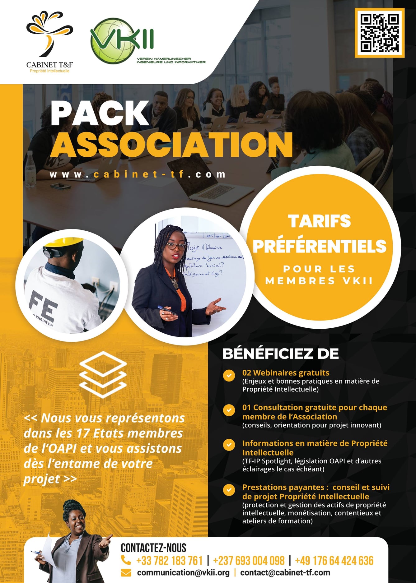 Spécialisé en propriété intellectuelle, le Cabinet T&F accompagne les entreprises dans leur développement stratégique et la création des richesses. Notre ambition est de garantir à tous nos clients, personne morale ou physique, un service de qualité dans l’espace OAPI et à l’international. A cet effet, nous vous assistons et vous conseillons pour la gestion optimale de vos actifs de propriété intellectuelle. Nous intervenons en particulier dans les domaines suivants : Droit des marques, Droit des brevets, Droit des dessins et modèles, Droit d’auteur, Concurrence déloyale, Marque et licence. Pour remplir cette mission, le Cabinet T&F travaille avec une équipe d’experts en droit des brevets, droit des marques, droit des dessins & modèles industriels, droit d'auteur et en marketing.