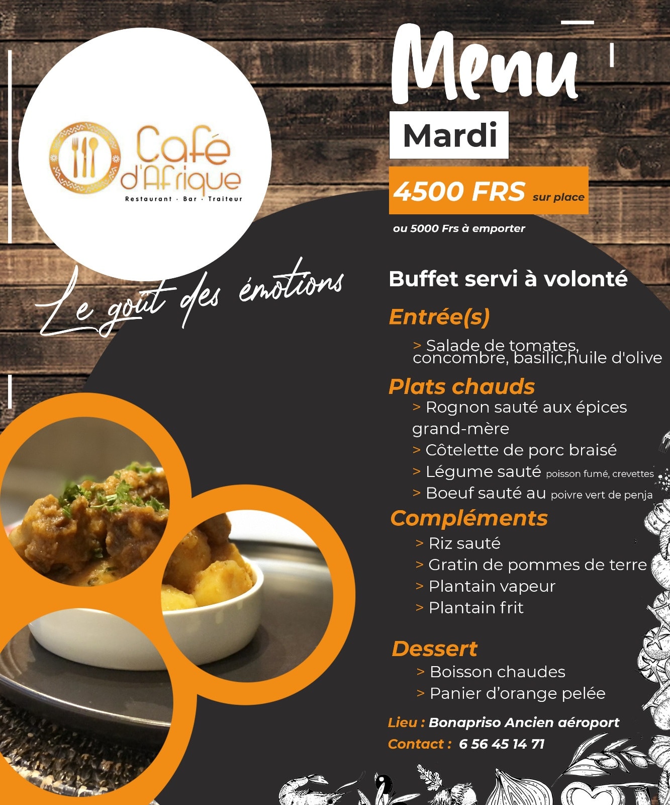 Café d’Afrique est un restaurant où l’on retrouve les valeurs africaines, ces valeurs transmises de génération en génération et gardées jalousement tel un bijou précieux, où l’on retrouve cette ambiance connue jadis, dans les cuisines de nos grand-mères, nourris et enrichis de ses odeurs d’épices, de son feu de bois et la joie de ses convives. On retrouve son amour pour ces plats qui ont bercés nos palets d’enfants, où l’on retrouve ce plaisir de voyager à travers le monde dans ses plats revisités à l’africaine.