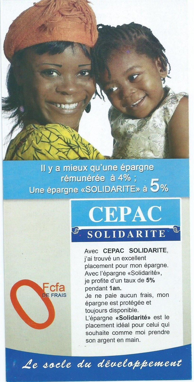 La Caisse d'Epargne et de Crédit de la Solidarité (CEPAC-SOLIDARITE) est un établissement de Micro Finance de 1ère catégorie agrée par le Ministère des Finances (MINFI) le 08 MAI 2002 comme sous le N° 00233/MINFI. Nous vous proposons de nombreux services notamment le service d’épargne, le service de financement et les services à valeur ajoutées. Avec une équipe de jeune dynamique et dévouée à la tâche, être proche de vous est une priorité pour la CEPAC-SOLIDARITE.