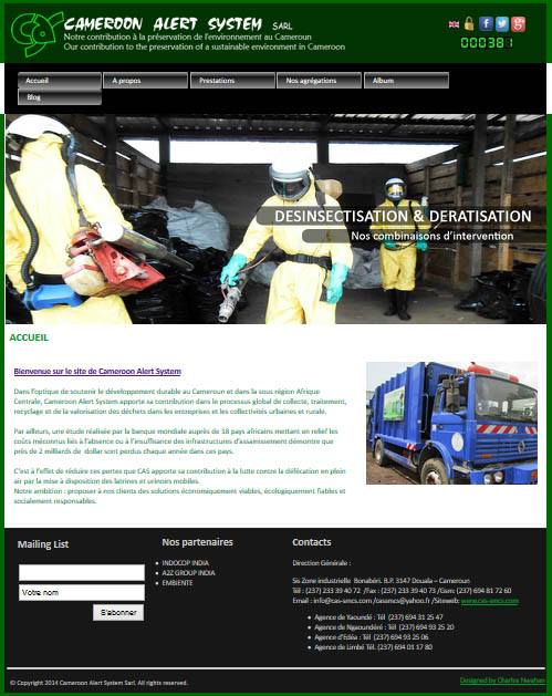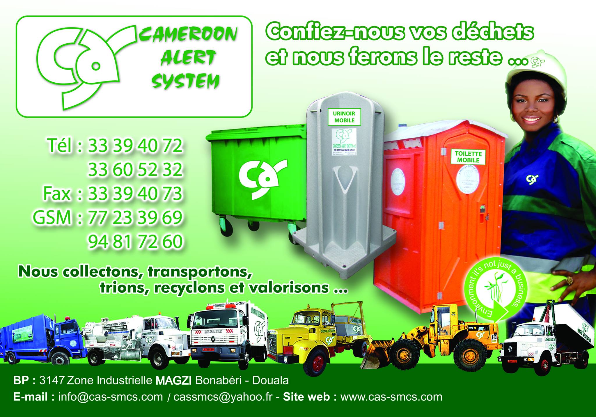 Cameroon Alert System Sarl (CAS Sarl) est une PME camerounaise aux capitaux privés. Cette entreprise de prestation de services a vu le jour en 1996. Elle offre des services dans les technologies et techniques propres de l’environnement.  Aujourd’hui, elle compte quatre (04) agences reparties sur le territoire national : YaoundéNgaoundéréEdéaLimbé.