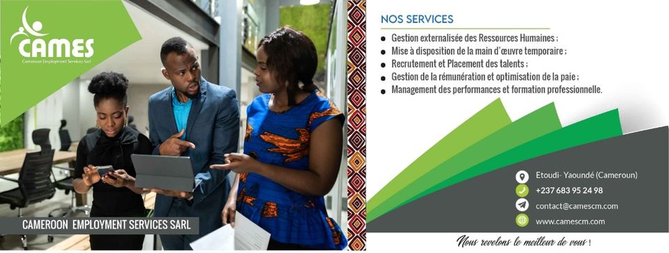Cameroon Employment Services Sarl (CAMES) est une entreprise spécialisée dans la gestion externalisée des ressources humaines. Elle vous accompagne dans le développement de solutions adaptées à l’optimisation de votre personnel et la performance de votre entreprise. Elle prône par un service de proximité en cheminant avec vous tout le long de notre accord afin de garantir votre satisfaction. CAMES met à votre disposition des experts en management des organisations et des ressources humaines, une base de données employés généreusement fournie et d’une grande diversité de profils. Aussi, à travers ses équipes de professionnels du métier, elle allège votre charge de travail et vous offre ainsi l’opportunité d’une plus grande concentration sur votre cœur d’activité.