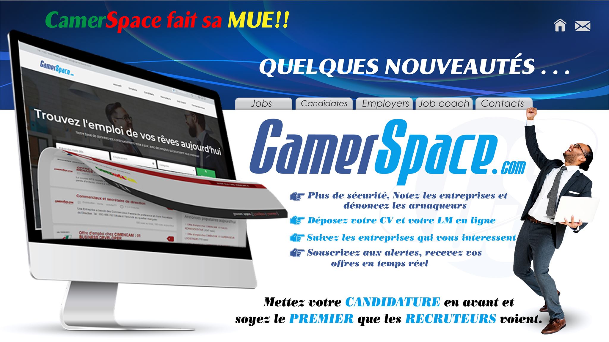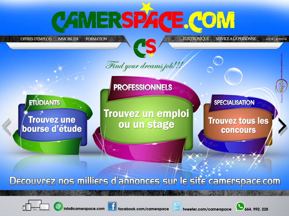 Camerspace est une plateforme pour toute personne qui aimeraient vendre et acheter des choses, obtenir un bon job partout dans le pays ou ailleurs sans se déplacer de sa chambre. Nous sommes votre site d’annonces pour trouver des offres d'emplois récentes, jobs, recrutements, concours, bourses d'études, stages au Cameroun.