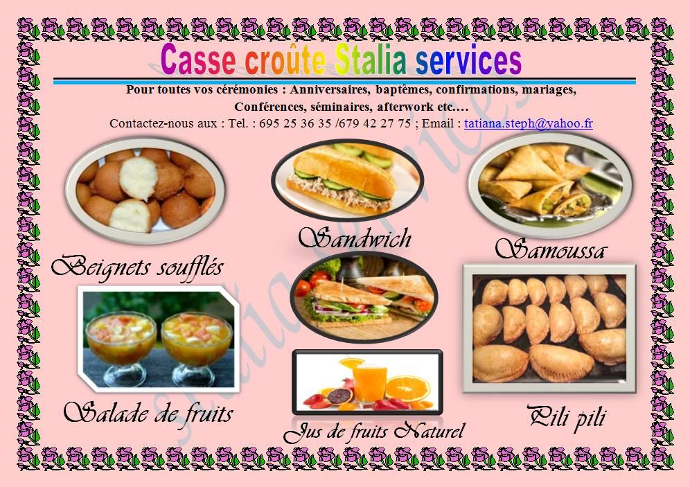 Casse-Croûte Stalia Services est un fast-food encore uniquement en ligne, spécialisé qui vous fournit des repas légers et succulents tels que : crêpes, samossas, sandwichs, jus de fruits, salade de fruits, brochettes, rôti de poulet, poisson, et bien d'autres. Si vous avez des évènements comme : un mariage, un cocktail, un anniversaire, une conférence, un séminaire etc... nous sommes la solution qu’il vous faut.