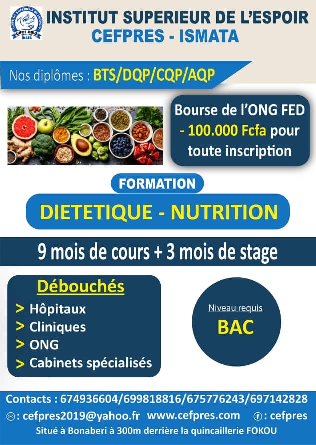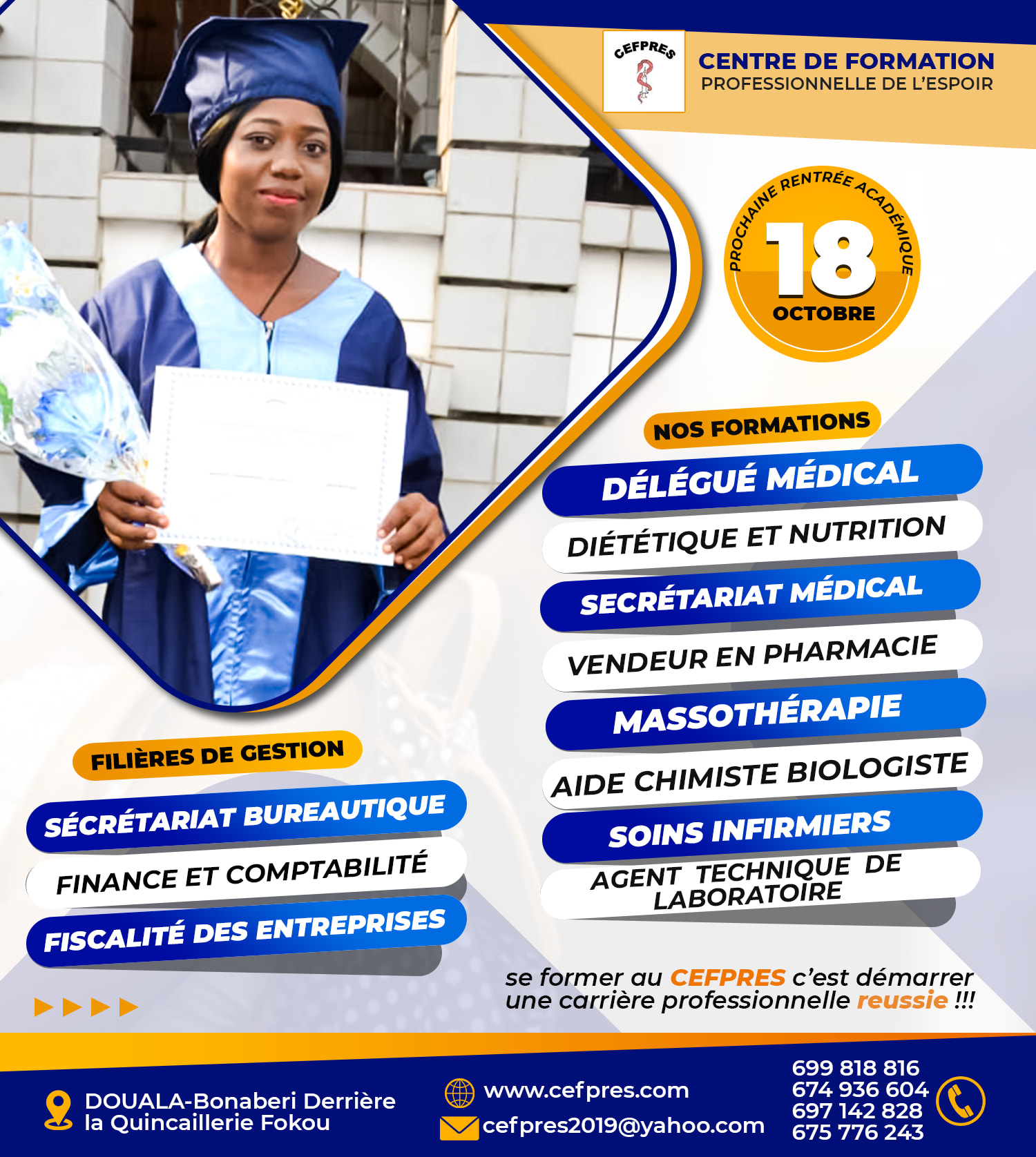 Le Centre de Formation Professionnelle de L´Espoir (CEFPRES) est un centre de formation professionnelle qui offre des formations pour les métiers de la santé. Le Centre de Formation Professionnelle de L´Espoir forme les apprenants dans les domaines paramédicaux suivant : Délégué médical, diététique-nutrition, vendeur en pharmacie, secrétariat médical, aide chimiste biologiste, massothérapeute. Le CEFPRES offre des formations organisées en module donnant lieu à plusieurs évaluations. Les enseignements comprennent deux volets : Les enseignements théoriques et pratiques ; les stages hospitaliers à effectuer à la clinique Médico-chirurgicale de l´Espoir (CEMECES) et autres formations hospitalières de la région du Littoral.