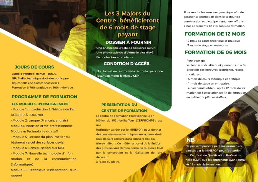 Le CEPROMPS est le premier Centre de Formation Professionnelle en Métier de Plâtrier Staffeur camerounais. CEFPROMPS vous propose une formation qualifiante, validée par l'Etat camerounais et reconnue par le monde professionnel, vous permettant d'acquérir des compétences et aptitudes à l'exercice d'un métier en plâtrier staffeur et aussi en peinture pour une durée de 3, 6 et 12 mois. Votre formation est sanctionnée par un examen national qui vous permet d'obtenir un certificat de qualification professionnel (CQP).