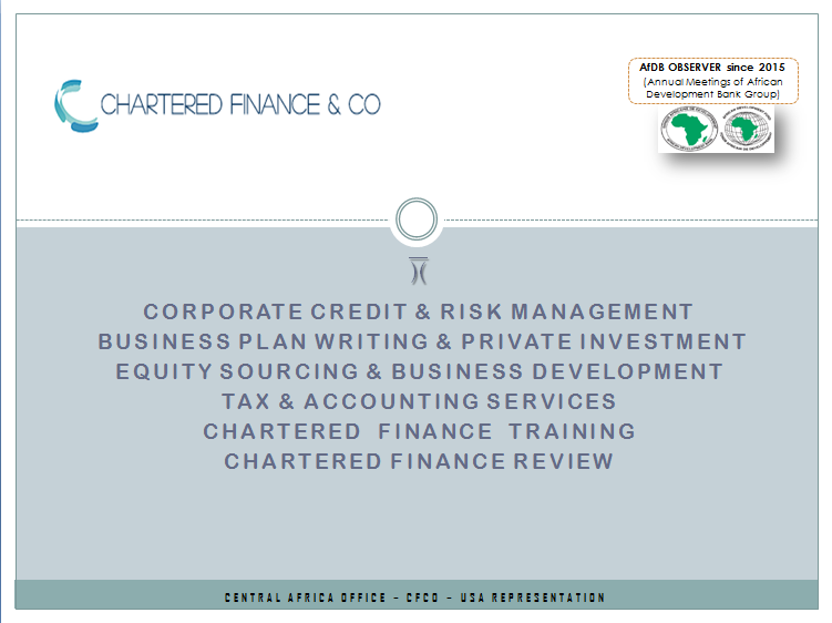 Chartered Finance & Co est depuis 2016 un observateur de la Banque Africaine de Développement et une firme de renseignement incorporée spécialisée dans le développement des affaires, l'approvisionnement en services financiers, formation professionnelle, environnement de financement d'entreprise, analyse économique et financière dans la sous-région de l'Afrique centrale. Chartered Finance & Co a été fondée en 2012 comme une plate-forme de Conseil numérique et mise à jour par l'unité de recherche indépendante VOB R&D en 2014.
