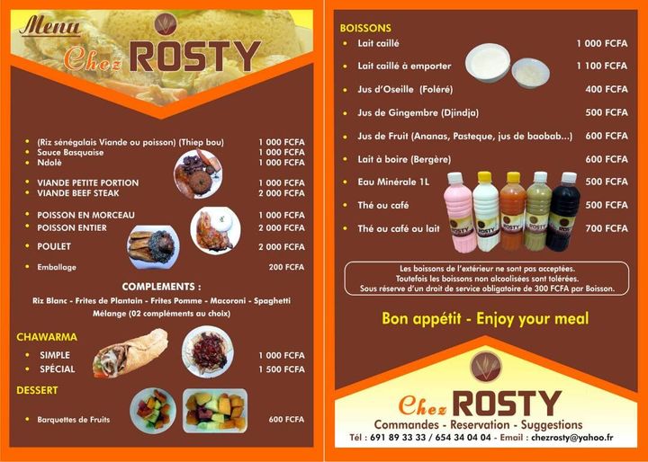 Chez Rosty est le restaurant qui offre le meilleur de la cuisine africaine et européenne. L’ambiance familiale qu’il offre tout en servant certaines des meilleures cuisines africaines à un prix abordable est tout simplement remarquable. Chaque fois que vous entrez dans ce restaurant, vous serez submergé par le confort, le charme terre à terre qui y règne, le goût des boissons faites maison et des plats incroyables. Le riche festin culinaire que Chez Rosty présentera devant vous avec ses bons plats sénégalais, des boissons spéciales faites maison est une chose à laquelle personne ne peut jamais dire non. Le service et l'ambiance chaleureuse de ce restaurant gagnent le cœur de tous. Chez Rosty vous accueille à Bonamoussadi, Deido, Bali et Bonapriso.